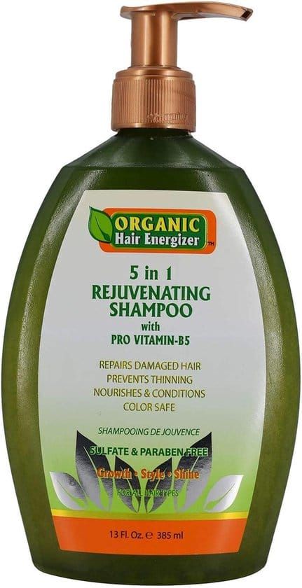 The revolutionary sulfate and paraben-free Organic Hair Energizer 5 in 1 Rejuvenating Shampoo with Pro Vitamin B5 is the first step toward thicker, fuller, stronger hair. It gently washes away impurities that can prevent proper hair growth, while it adds nourishment without weighing down your hair.