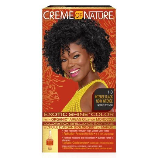 Creme of Nature’s 1.0 Intense Black hair color with Moroccan Argan Oil combines long-lasting coverage with nourishing care. Thanks to Strengthening Micro-Sphere Technology , which infuses super-strengthening conditioners and vitamins deep into the hair fiber, hair damage, dryness, and breakage are prevented during the coloring process. The result: strong, healthy hair with an Exotic Shine™ .